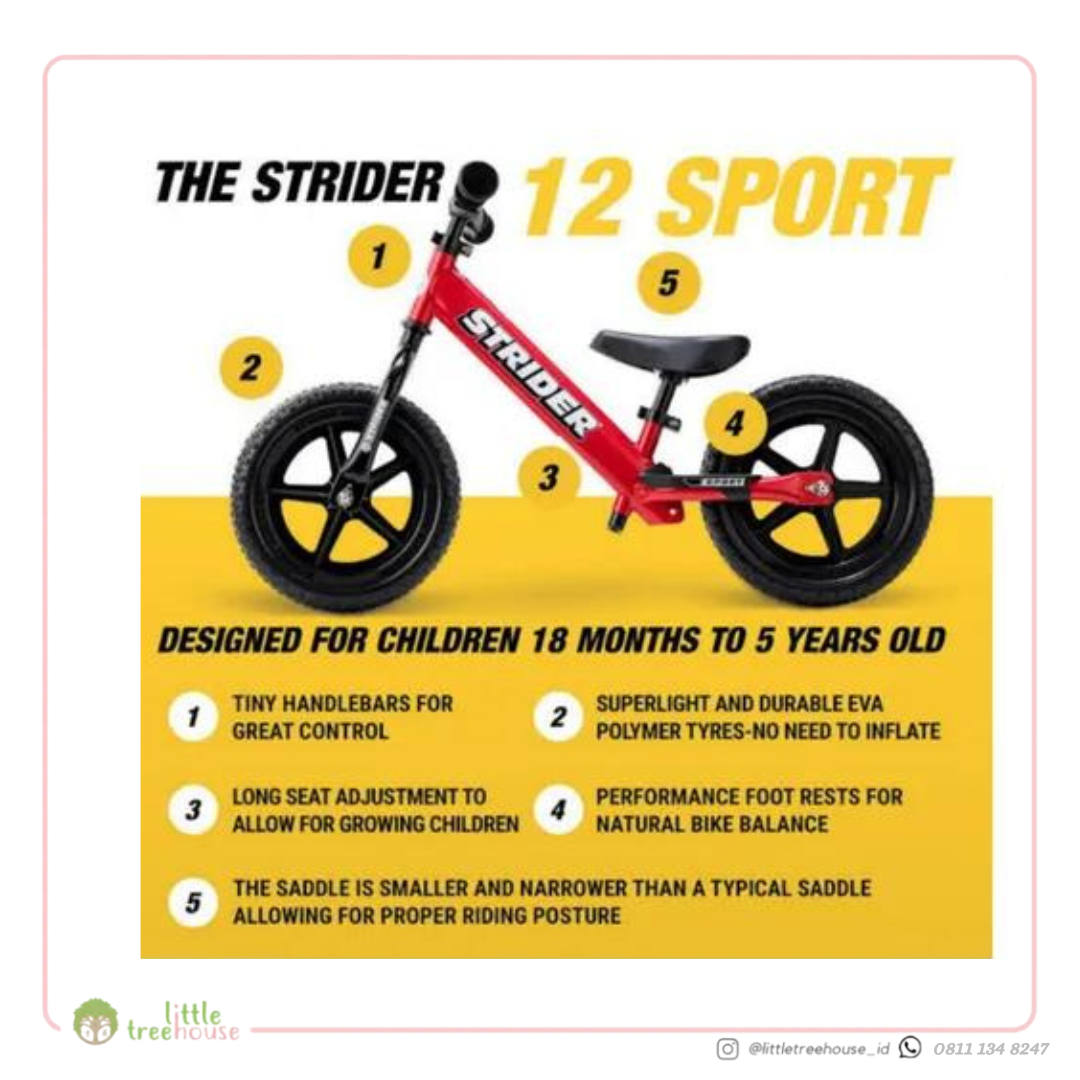 Balance Bike adalah sepeda tanpa pedal yang bertujuan untuk melatih anak mencari keseimbangan dalam bersepeda. Kini Anda dapat menyewa Strider 12 Sport Balance Bike. Rangka sepeda terbuat dari baja dan rodanya dibuat dengan teknologi tinggi sehingga perawatannya tidak sulit. Tinggi dudukan dan handlebar dapat disesuaikan dengan perkembangan anak tanpa menggunakan alat. Tidak hanya itu, sepeda ini juga memiliki pijakan kaki built-in, dengan dudukan empuk yang nyaman serta terdapat bantalan pada handlebarnya. Untuk usia 1.5 - 5 tahun. Range tinggi dudukan: 28 - 48 cm, untuk inseam anak 30 - 50cm. Berat sepeda : 3 kg. Sewa sepeda Strider balance bike untuk anak Anda sekarang!