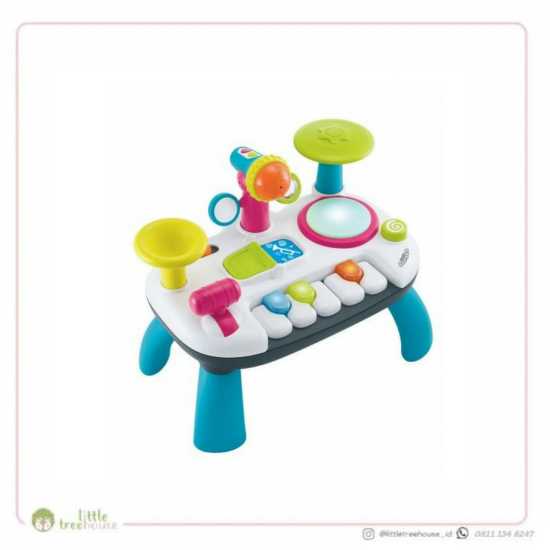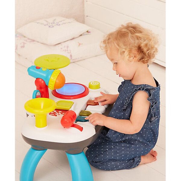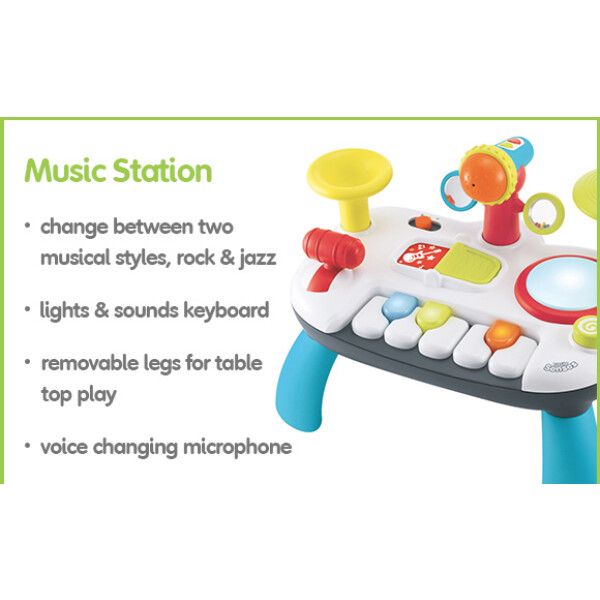 ELC Little Senses Lights and Sounds Music Station. Dengarkan suara yang menyenangkan, tekan keyboard, gedebuk drum, ketuk simbal, putar tanduk, bernyanyi bersama ke dalam mikrofon yang berubah suara dan temukan keajaiban musik !. Dengan kaki yang bisa dilepas untuk duduk dan bermain di lantai, atau bermain di atas meja, little senses music station ini memiliki begitu banyak untuk tangan dan pikiranuntuk dijelajahi dan ditemukan. Usia: mulai dari 2 tahun Features and benefits for little senses lights and sounds music station suitable for children from 12 months fun music station with lights and sounds removable legs 2 ways to play: music play along and free play keyboard with light up keys bang the drum for lights and sounds twist the horn to hear trumpet sounds voice changing microphone tap the cymbal to hear sounds flip the book to switch between rock and band music move the lever to hear fun sounds pressing, flipping, spinning and twisting to develop hand-to-eye coordination and fine motor skills encourages learning through play NOTE: TIDAK MENYEDIAKAN BATRAI BARU