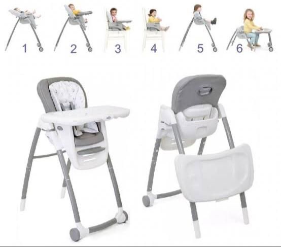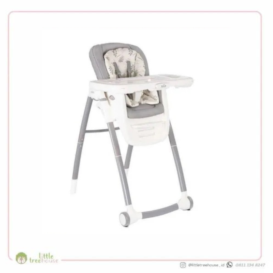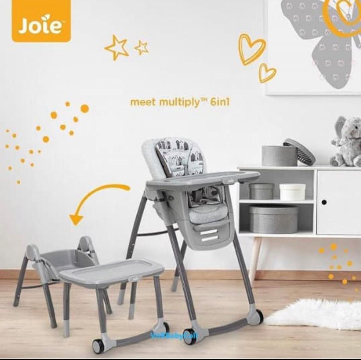 Joie High Chair Multiply 6in1 Dapat digunakan dr anak usia 6 bulan sampai 6 tahun berat maksimal 27Kg . * 1Kursi makan bayi dengan 6 fungsi : Little Lounger , Little Bites , Little Boost , Big Boost , Table time dan Play Time . * Kursi dapat diseusikan tinggi nya sebanyak 5 posisi . * Kursi dan rangka dapat dilipat dan beridiri tegak . * Tray yang besar dan dapat dilepas . * 3 posisi adjustable tray dilengkapi dengan cup holder . * Posisi duduk dapat diatur sebanyak 3 posisi . * Pad kursi removable dan dapat dicuci . * 3 Posisi pijakan kaki . * Dilegkapi dengan roda pada bagian depan untuk memudahkan pemindahan .5 point safety harness . * Penyimpanan tray unik dibelakang kaki .