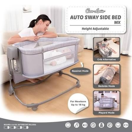 COCOLATTE | Auto Sway Sidebed with Bluetooth menawarkan kemudahan dengan 3 mode penggunaan: Bassinet, Bedside Sleeper, dan Crib Option. Dilengkapi dengan Auto Sway Mode untuk meniru gerakan mengayun lembut lengan ibu, kanopi bermainan gantung dengan jaring anti nyamuk, panel kontrol Gentle Touch, remote control dan Bluetooth, serta 5 kecepatan ayunan, stroller ini dirancang untuk memberikan kenyamanan dan keamanan yang tak tertandingi bagi bayi Anda, dilengkapi dengan roda yang dapat dikunci dan cradle yang bisa dilepas serta rangka yang dapat dilipat untuk kemudahan dan kepraktisan maksimal.