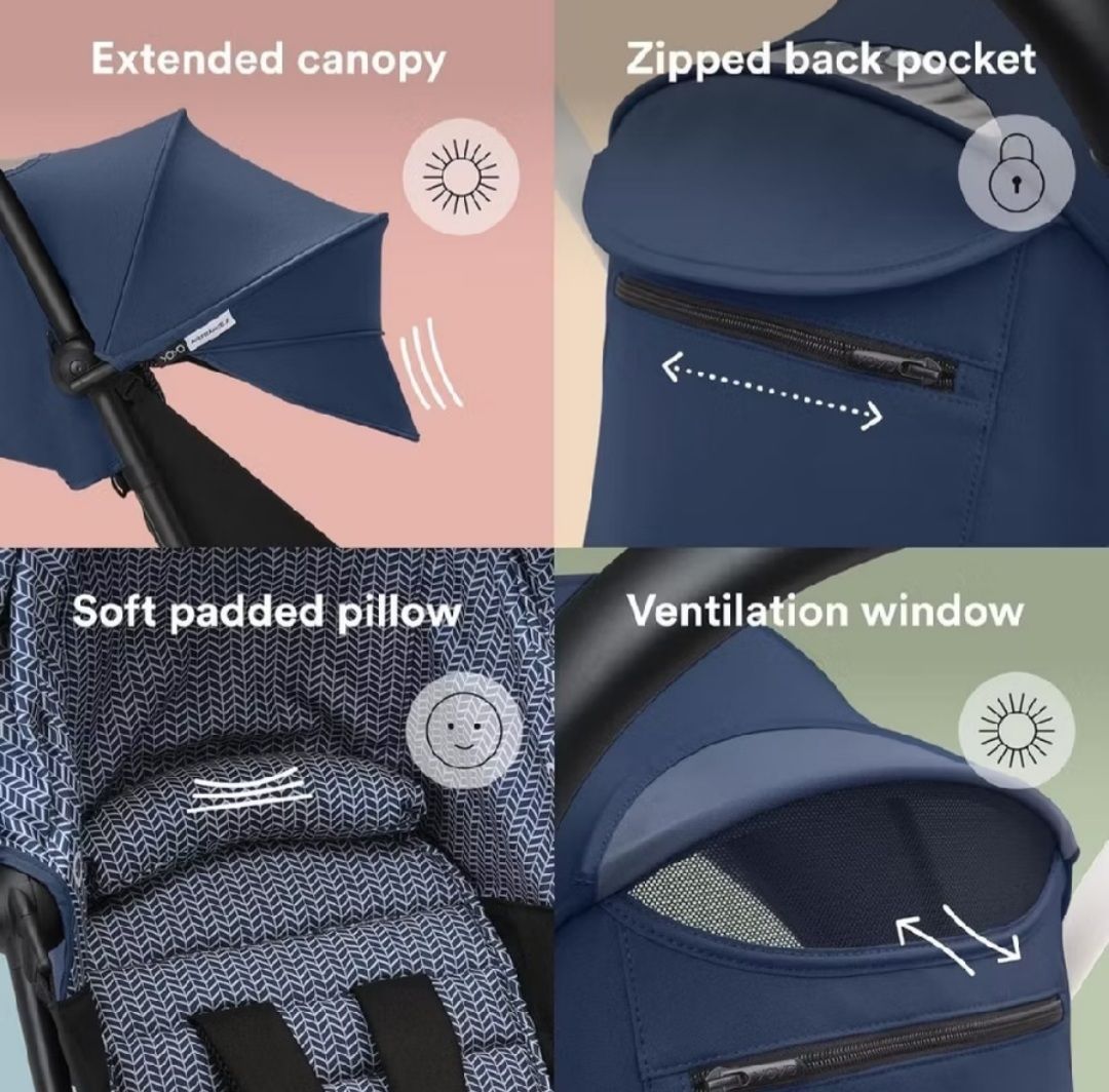 - Extendable anti-UV canopy with peak-a-boo and closeable ventilation window